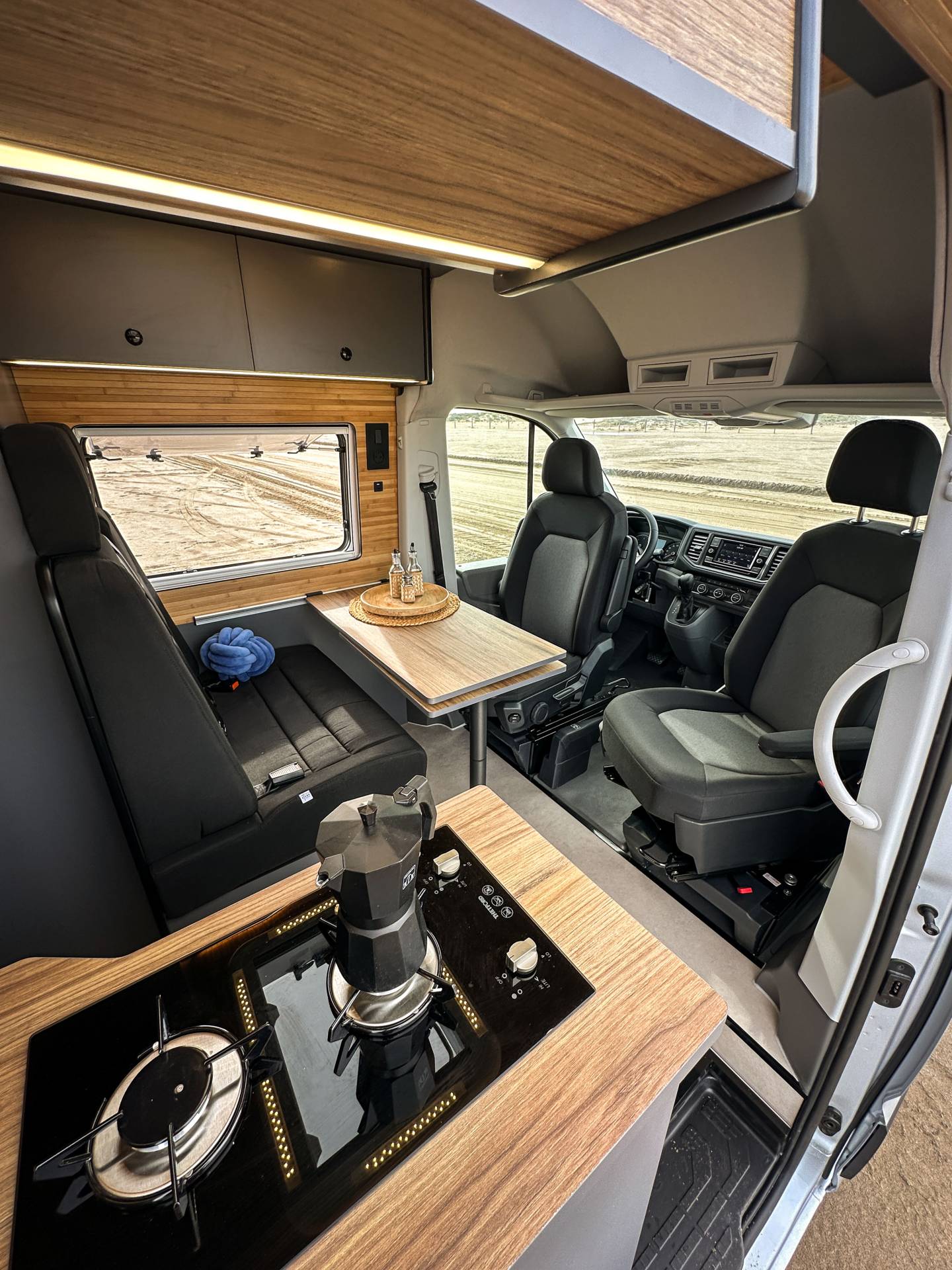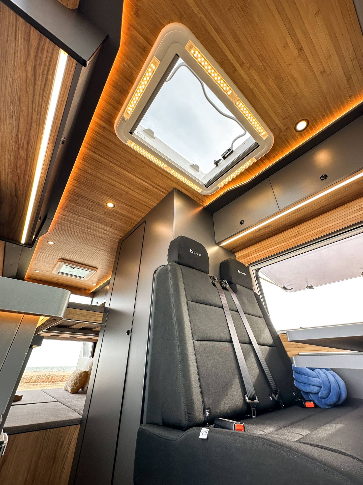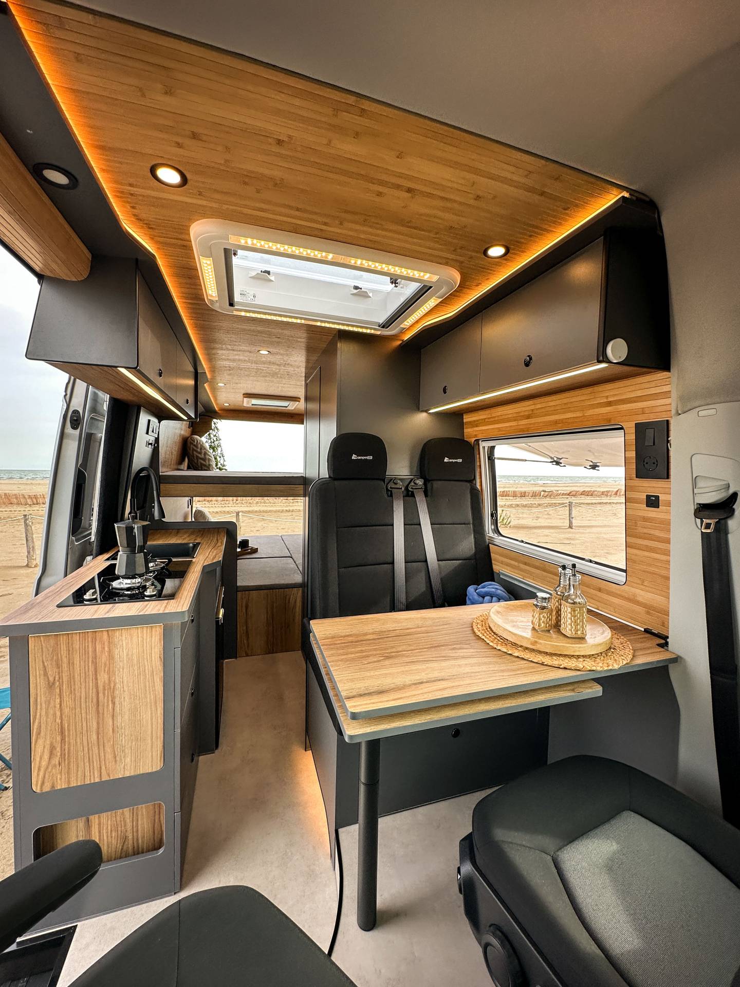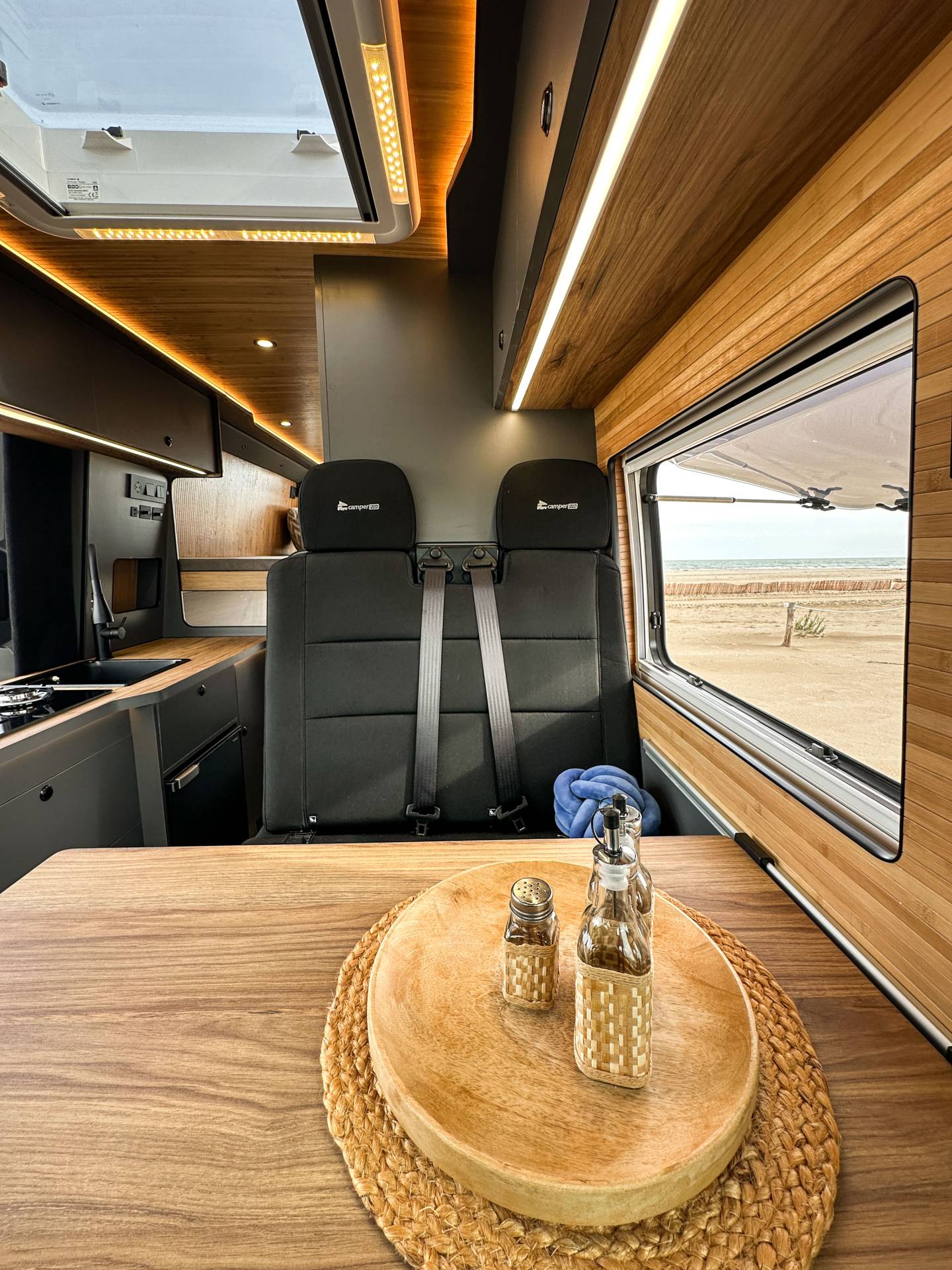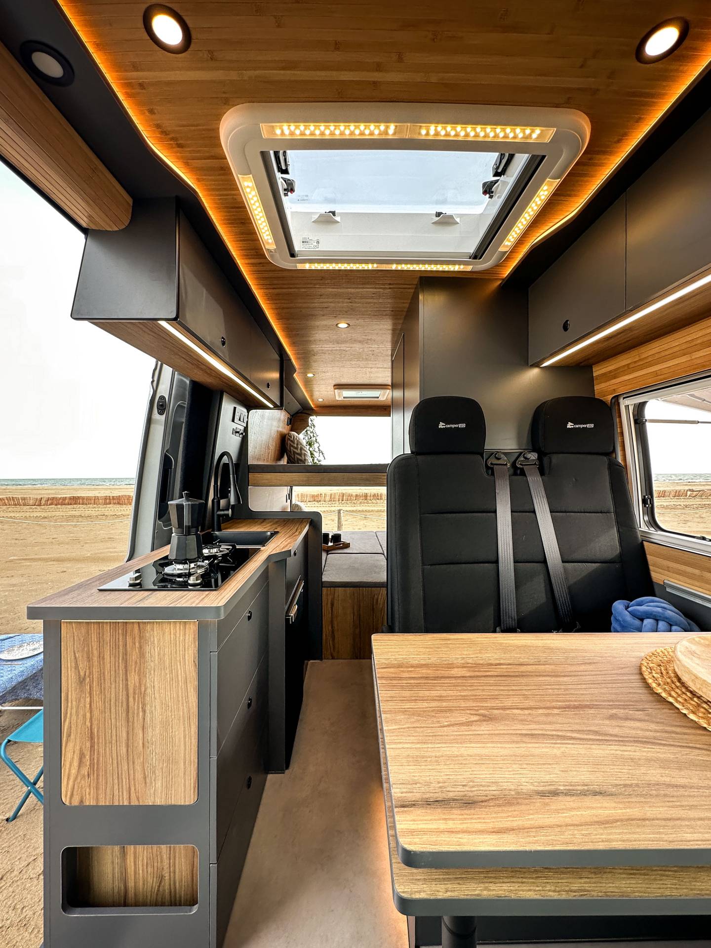 Madera cálida, iluminación indirecta y una distribución que convierte la camper en un auténtico hogar sobre ruedas.