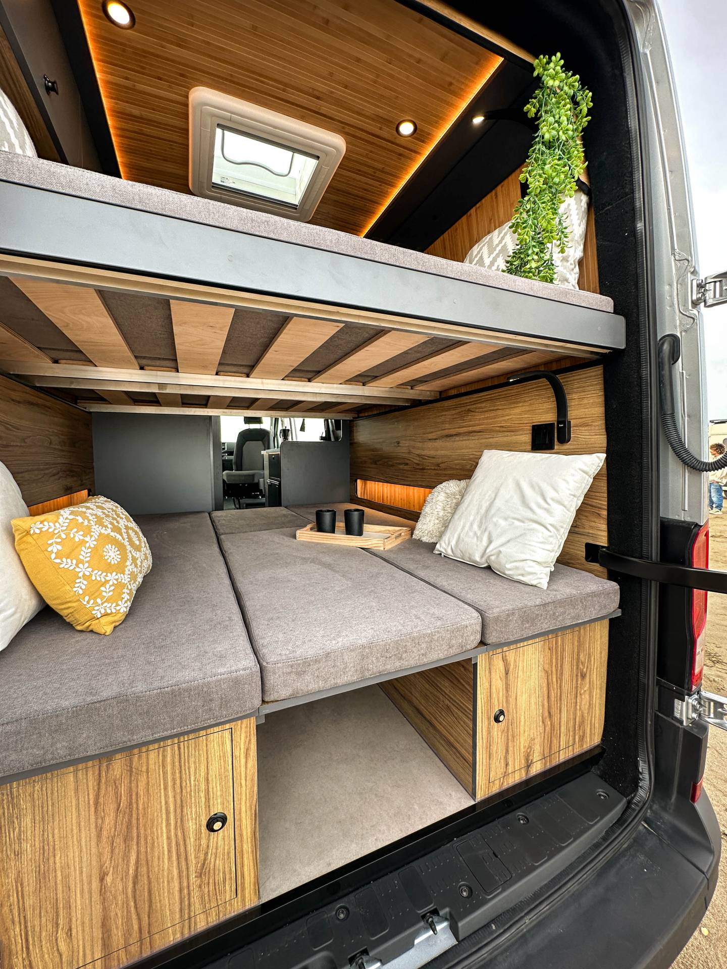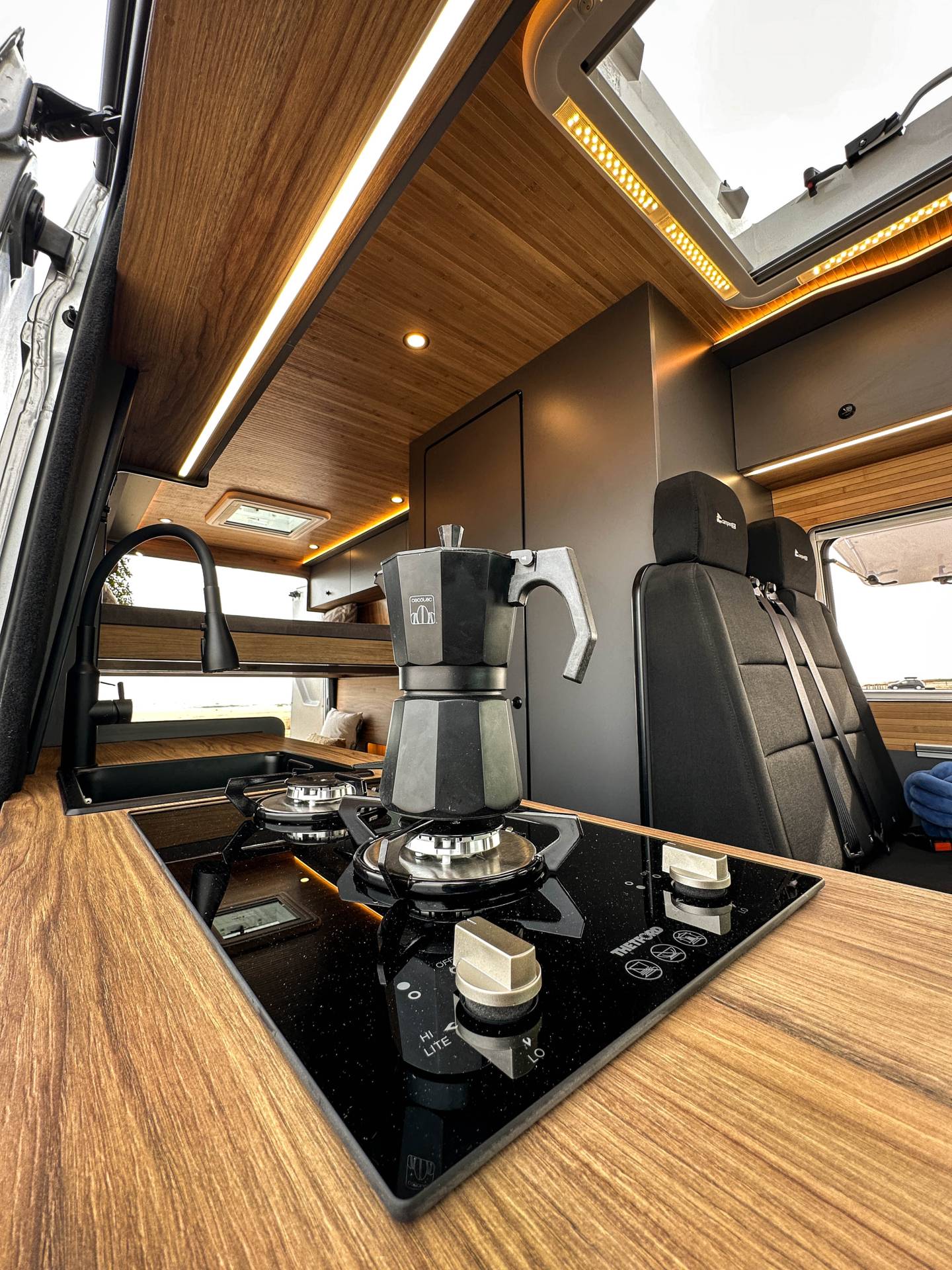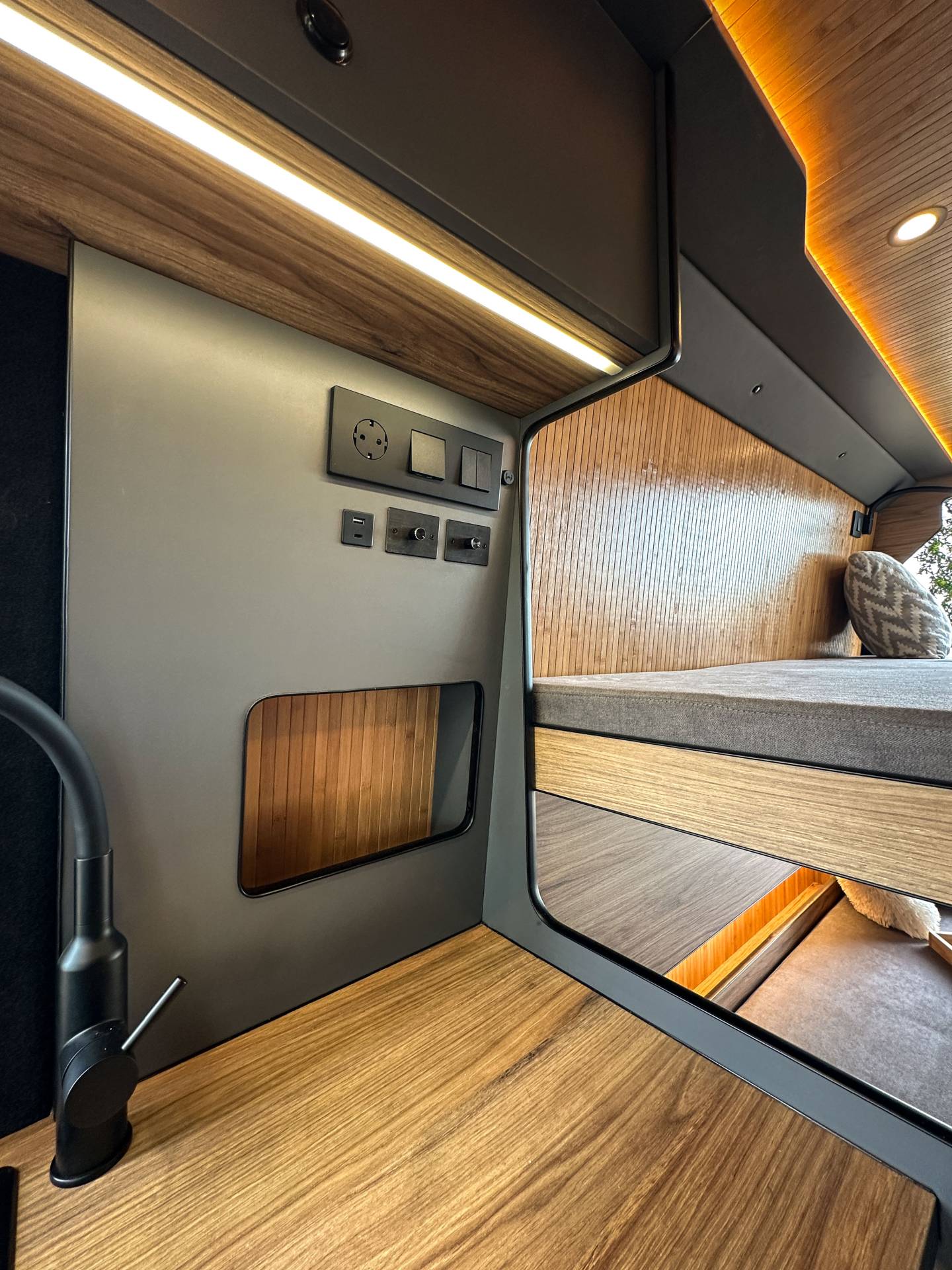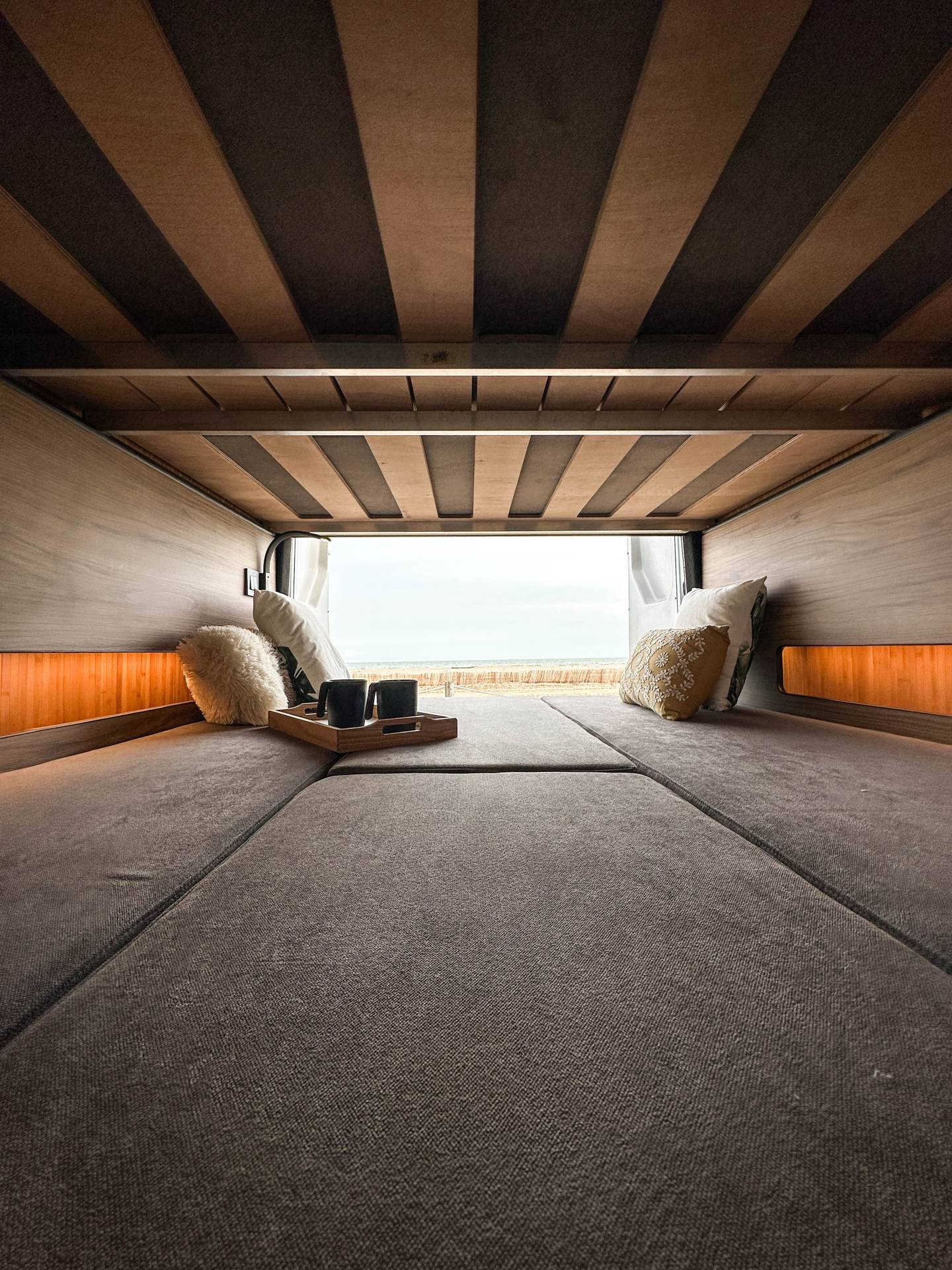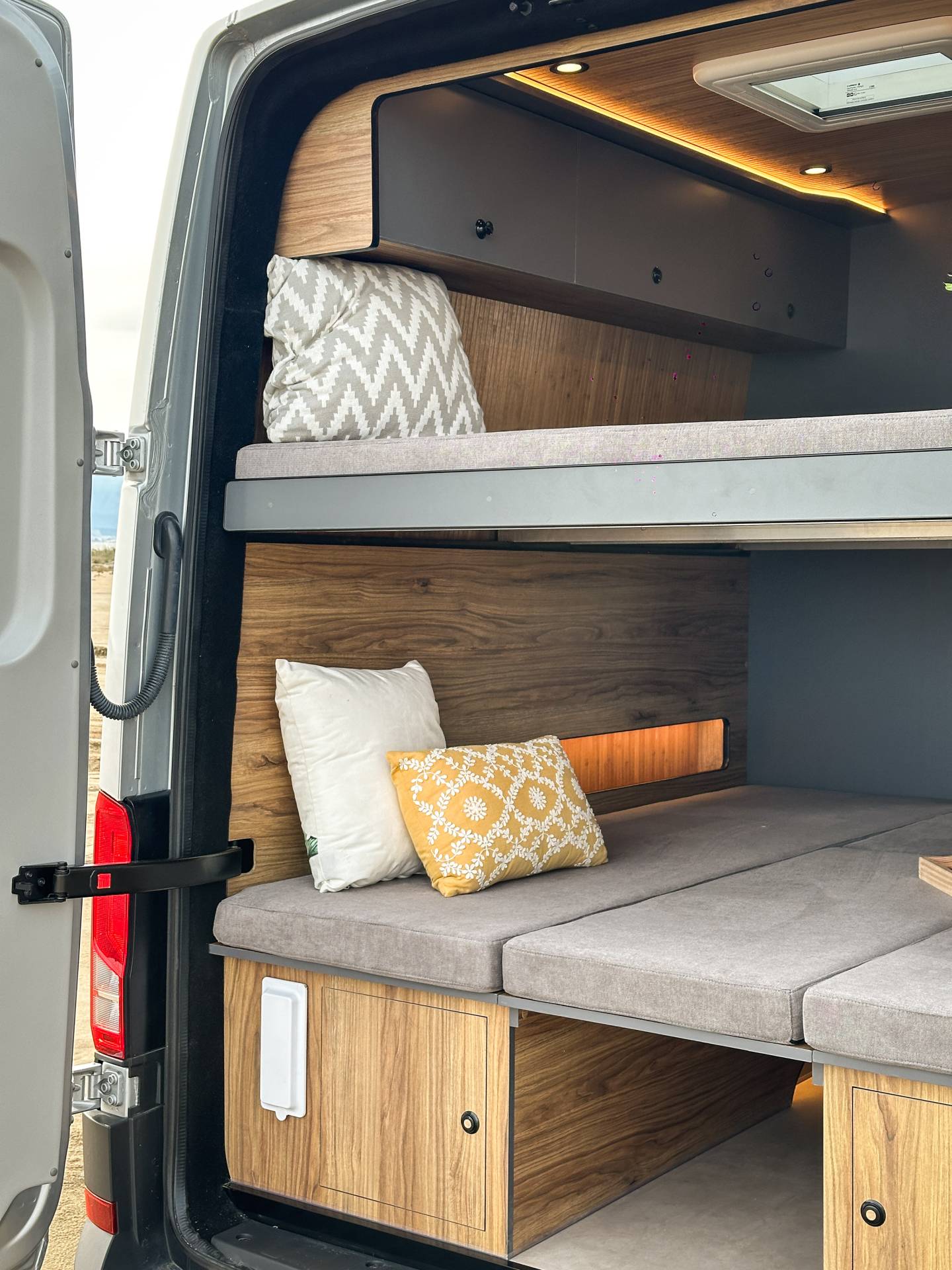 Madera cálida, iluminación indirecta y una distribución que convierte la camper en un auténtico hogar sobre ruedas.
