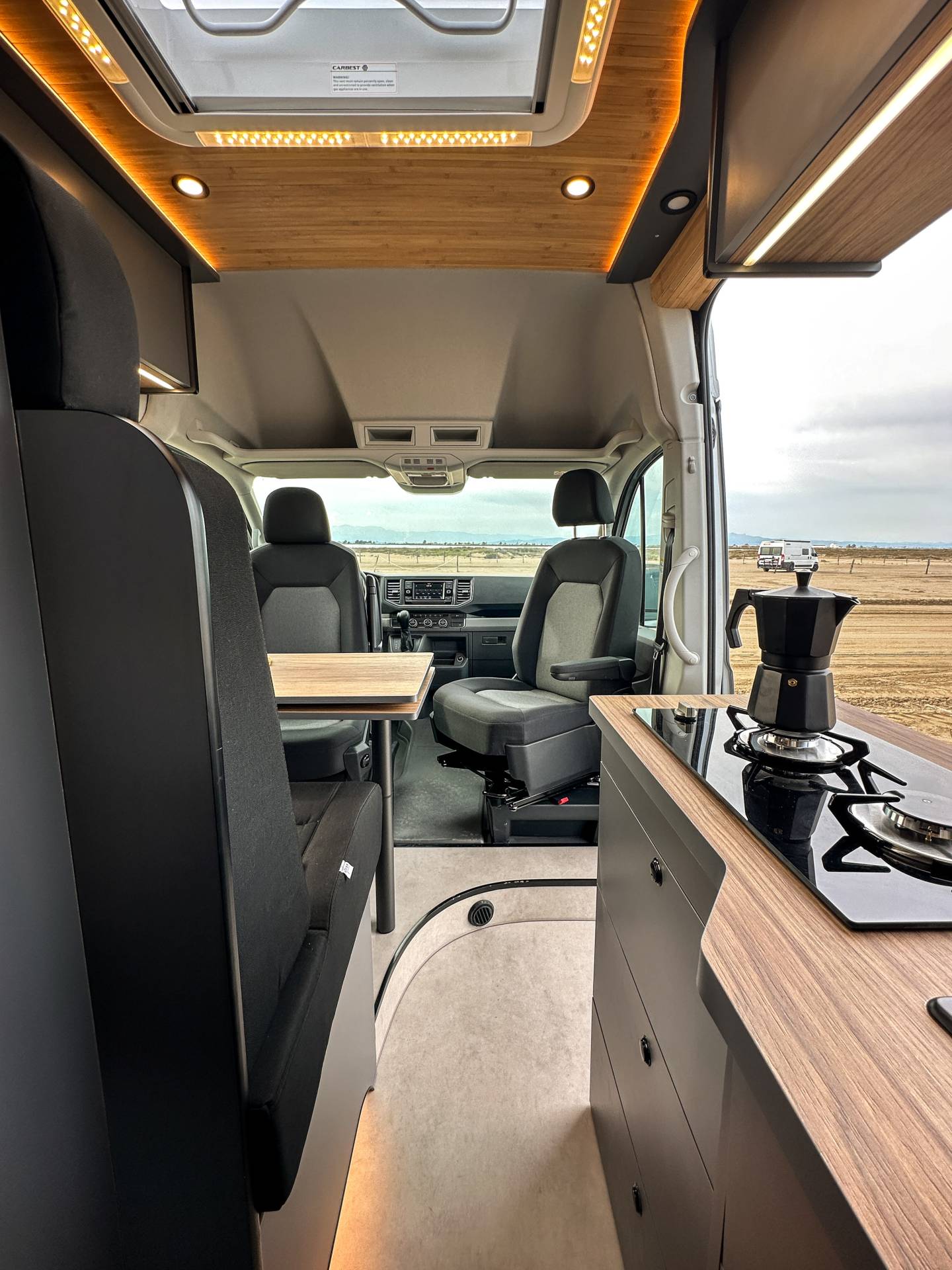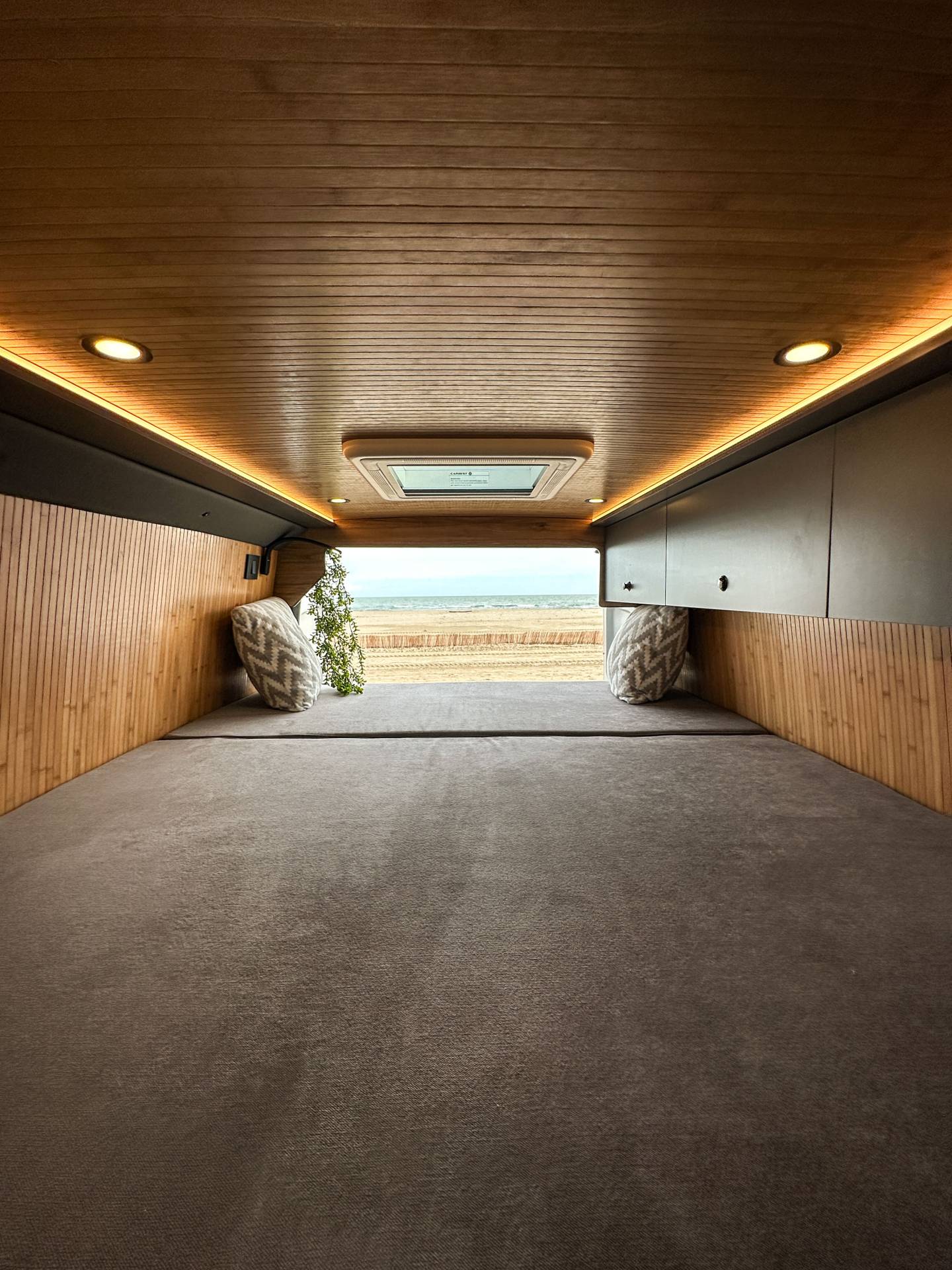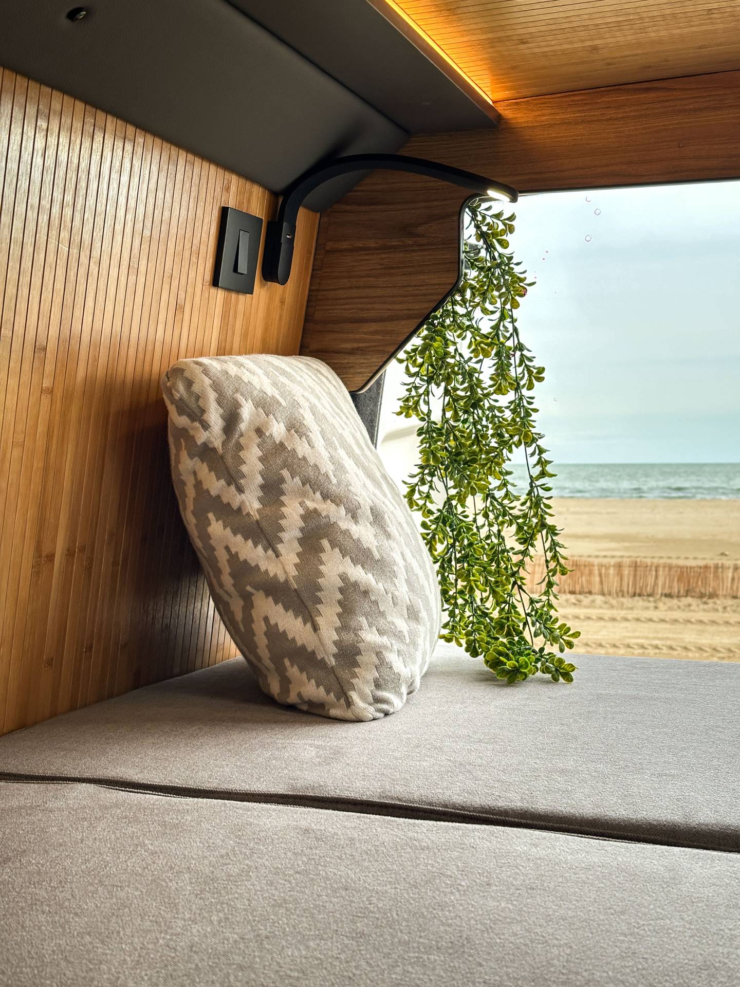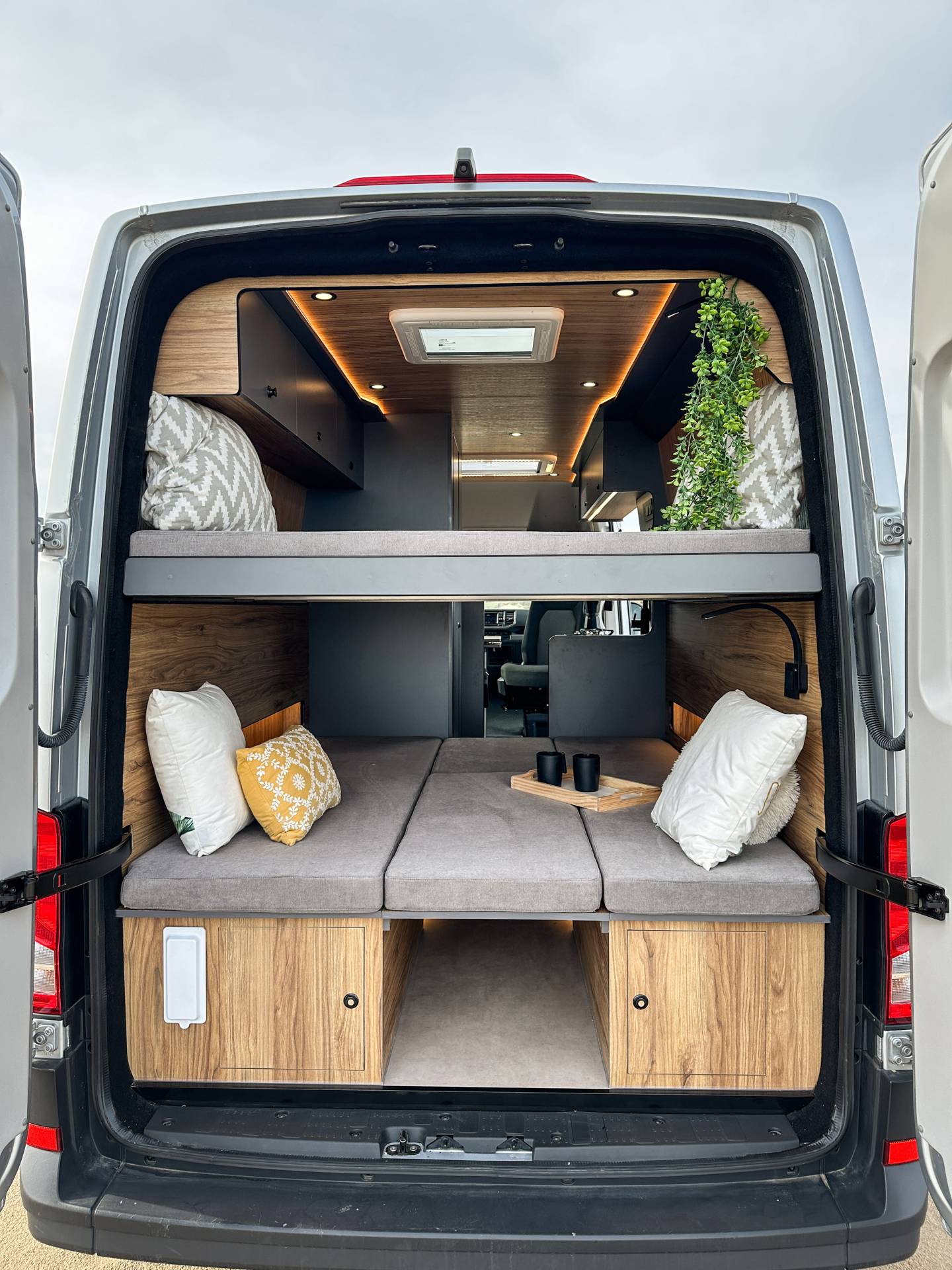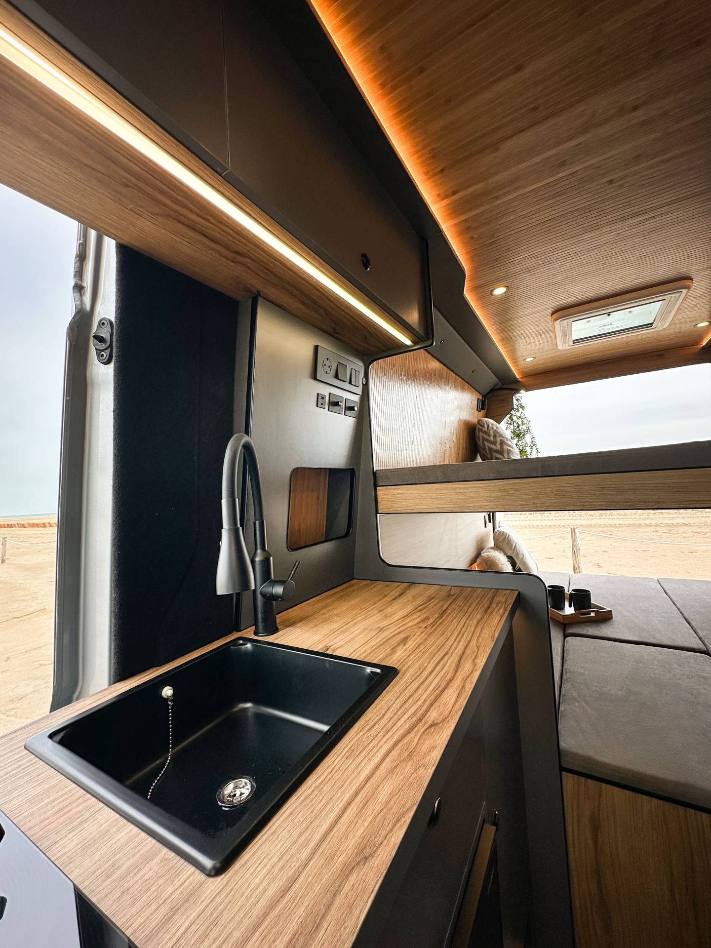 Madera cálida, iluminación indirecta y una distribución que convierte la camper en un auténtico hogar sobre ruedas.