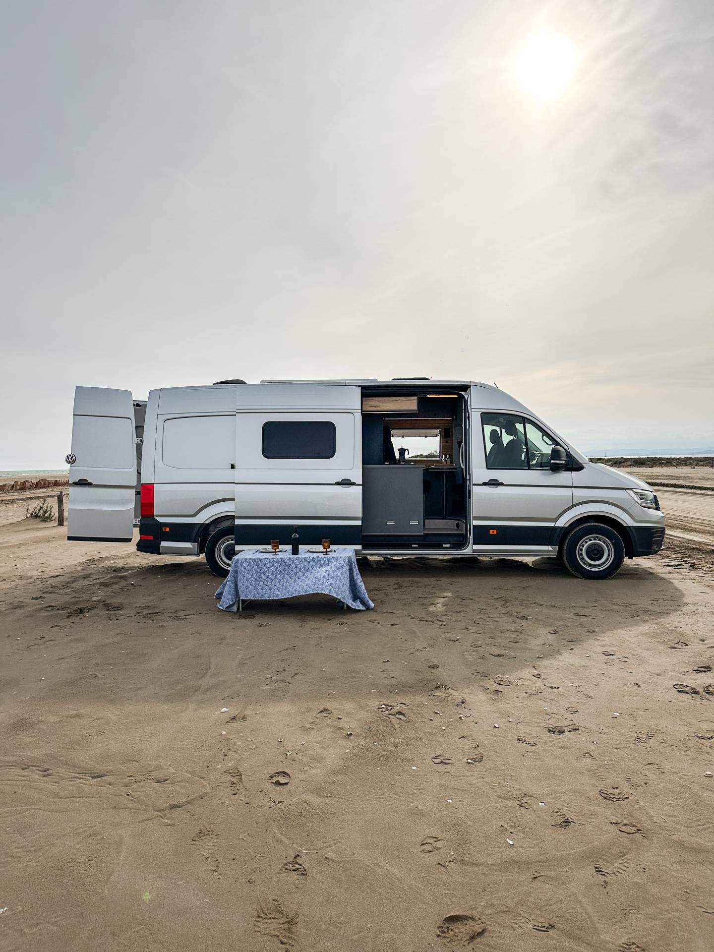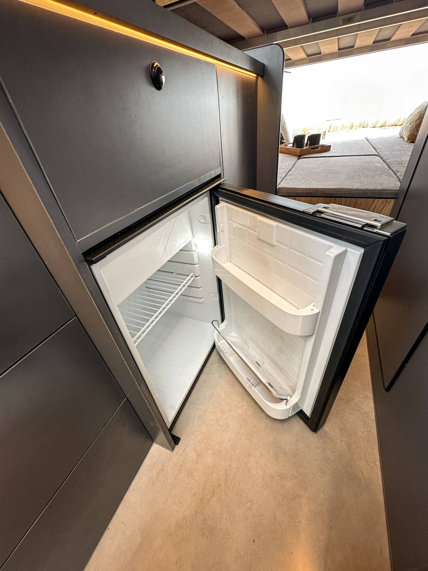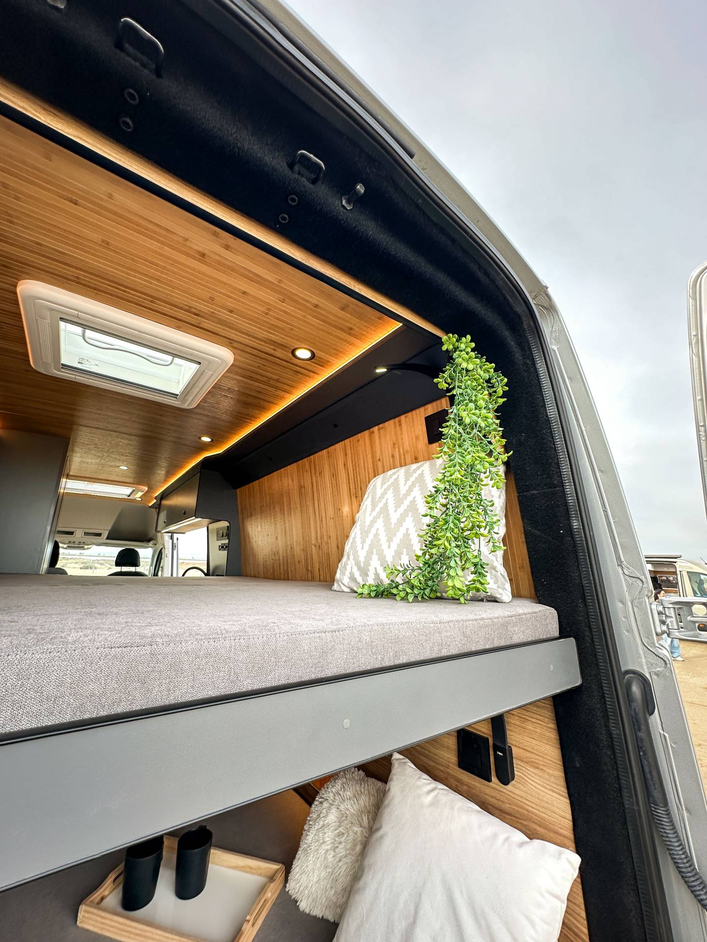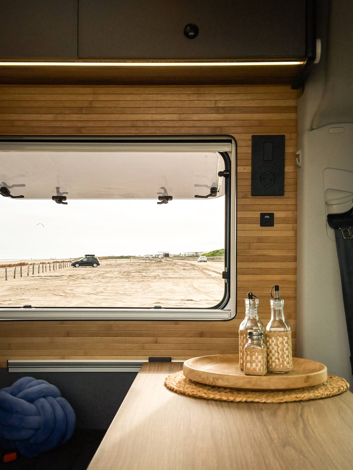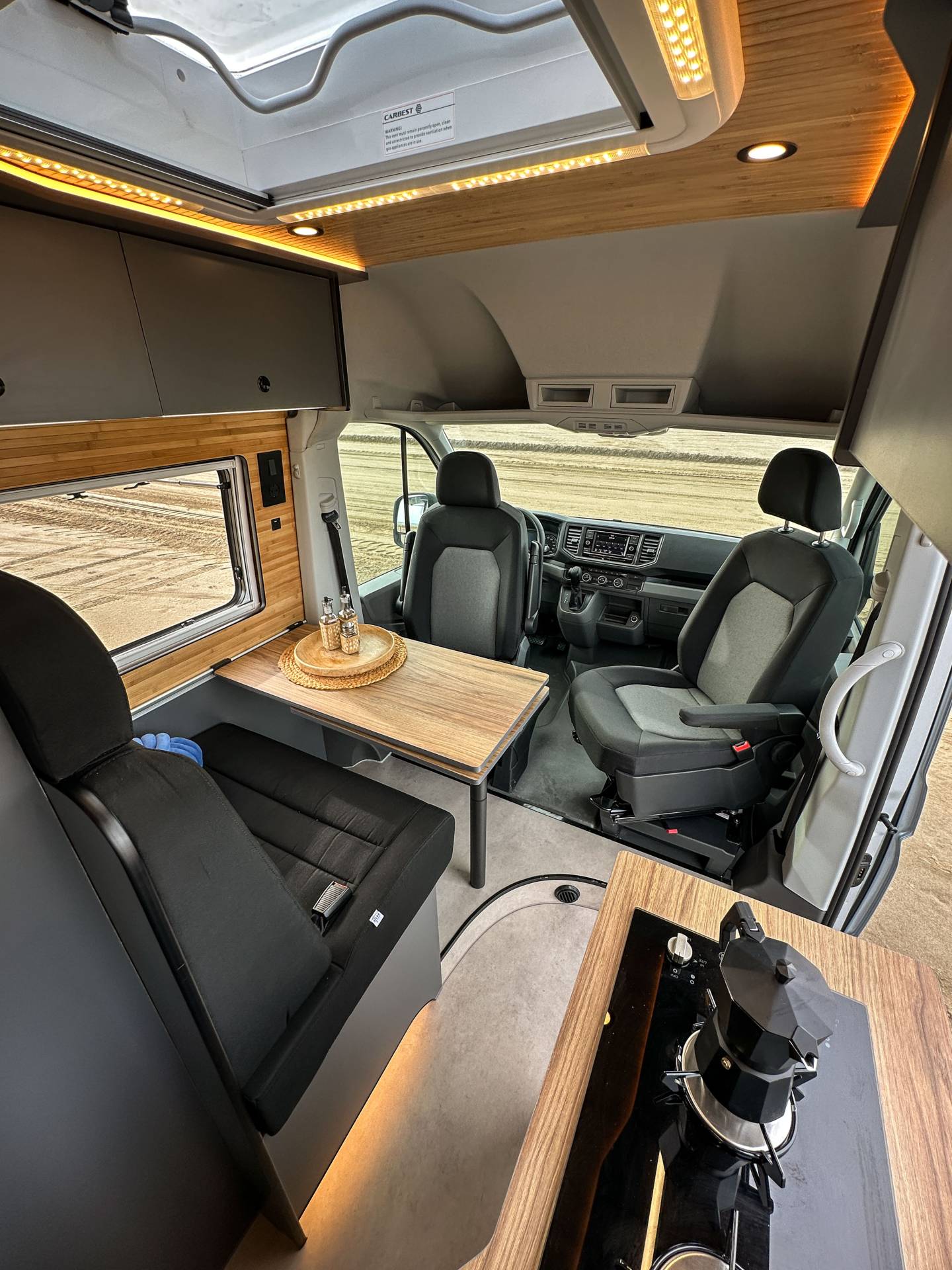 Madera cálida, iluminación indirecta y una distribución que convierte la camper en un auténtico hogar sobre ruedas.